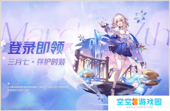 此外,在3.0版本期间登录游戏并解锁【角色】功能,即可免费领取「三月七·存护」的时装「冬去煦至」!活动结束后,该时装将上架商店。获得时装后还可获得时装对应头像。